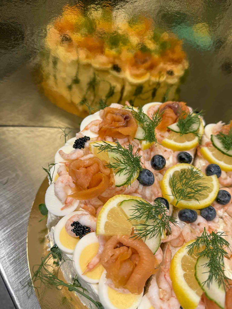 Räkor, kallrökt lax och ägg. Byggd i tre krämiga lager på luftiga landgångsbröd. Toppad med handskalade räkor, kallrökt lax, ägg och garnering.